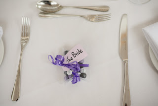 I bought clear plastic 'pillow' gift boxes for about £12 for 100 on Ebay, so we weighed the M&Ms and worked out how many we could have in each packet, and spent an evening filling the packets. We used my die cutting machine to cut out gift tags from purple card and my mother-in-law, who does beautiful calligraphy, kindly agreed to write the name of each guest on the label. I then took some purple ribbon, which I already had in my craft cupboard, and tied it around each M&M packet, attached the name label and used a pair of scissors to curl the ends.