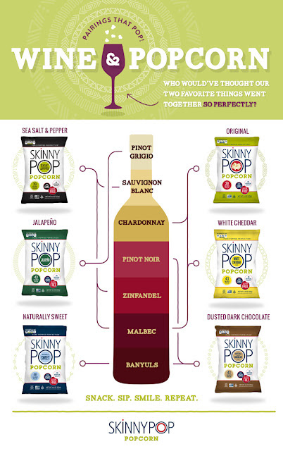 I've sometimes made popcorn at home to recreate the movie night feel and my preferred drink to enjoy at the same time is either a glass of crisp white wine or a vodka and coke. The people at Skinny Pop, which makes popcorn with no artificial flavourings and no trans fat, asked me to share the infographic above. They offer a range of flavours - though their products are only sold in the US - and suggest different wines to go with each one, which is an interesting idea and something I haven't come across before. So my preferred sauvignon blanc would go well with original or salt and pepper popcorn, whereas I've discovered that the sweeter popcorns, which I do think taste better, would go better with a glass of red. Have you thought about pairing your drinks to your snacks in this way?